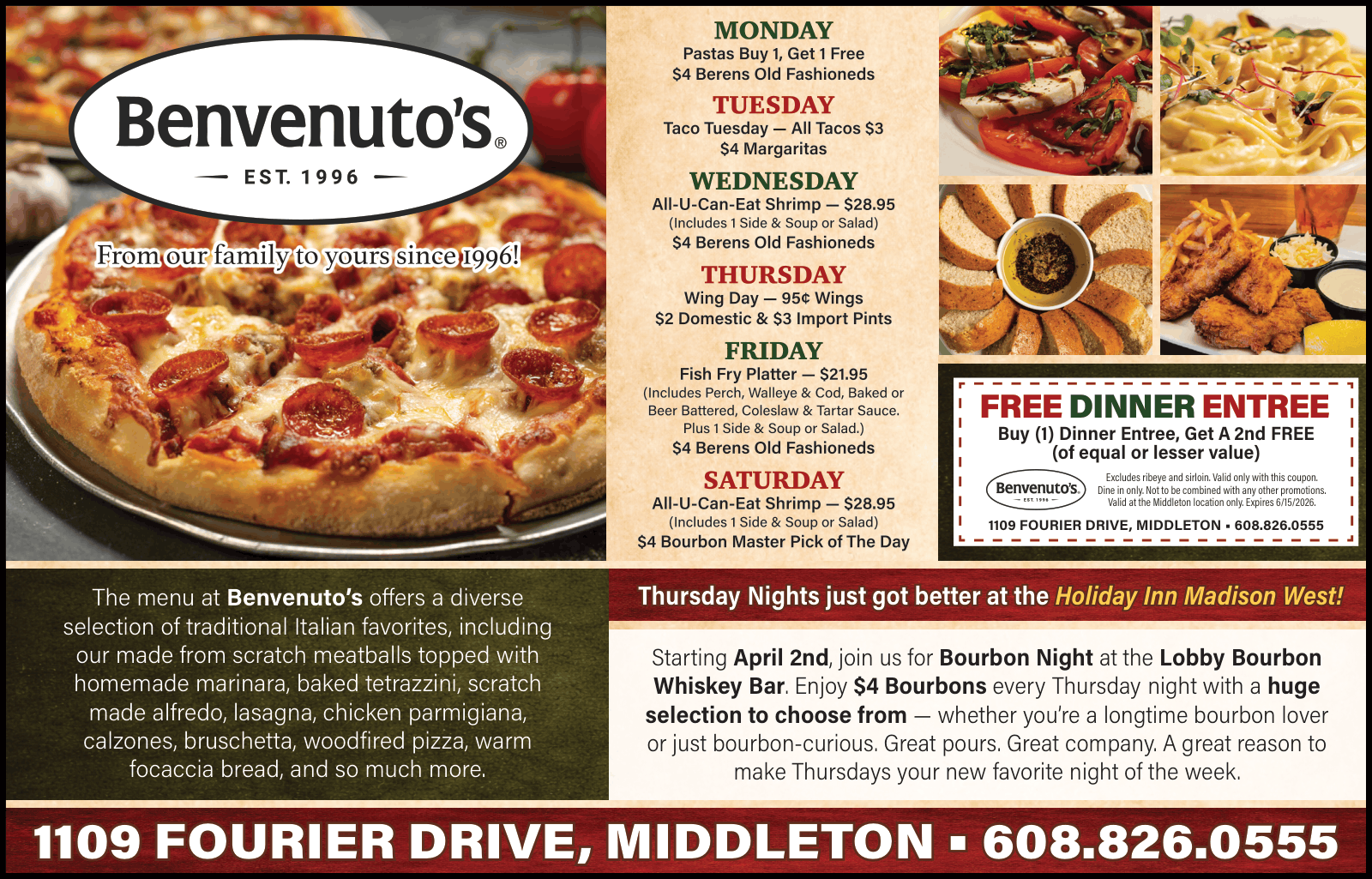 The menu at Benvenuto’s Italian Grill offers a diverse selection of traditional Italian favorites, including our made from scratch meatballs topped with homemade marinara, baked tetrazzini, scratch made alfredo, lasagna, chicken parmigiana, calzones, bruschetta, wood fired pizza, warm focaccia bread, and so much more.