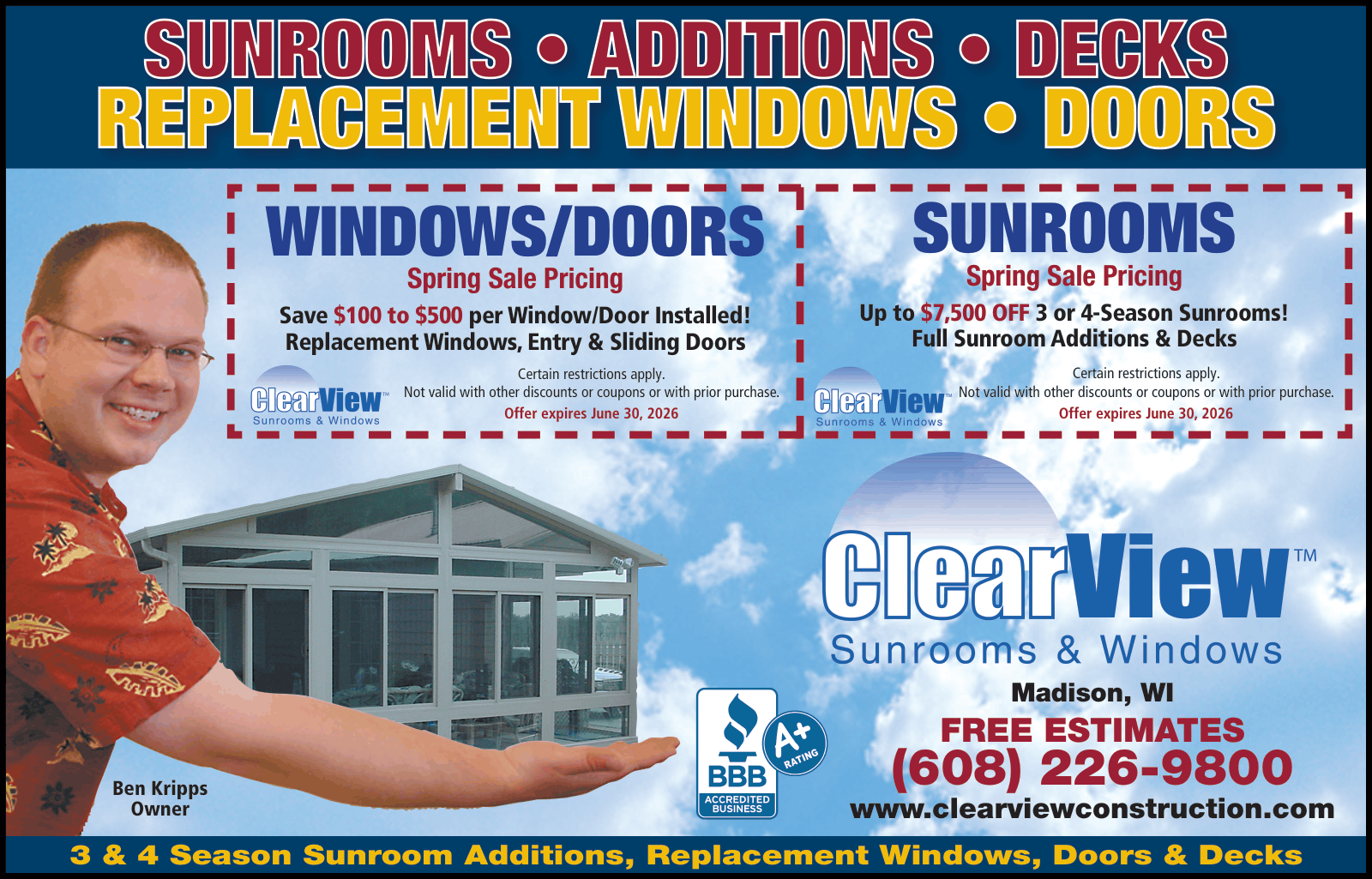 ClearView Sunrooms will design and install your custom built 3 or 4 season sunroom with minimal disruption in your daily routine during construction.
