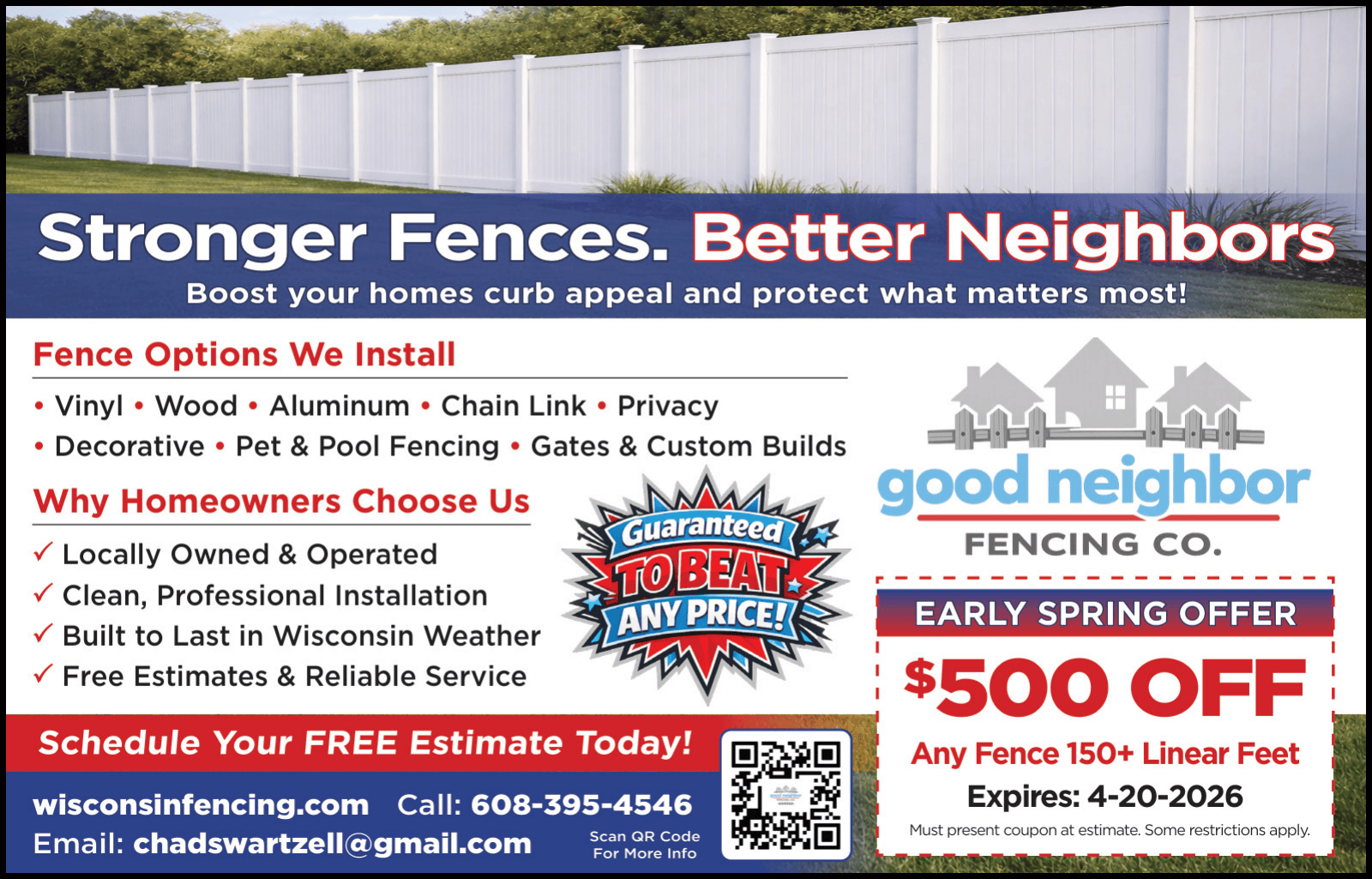 Good Neighbor Fencing is a Wisconsin-based fencing contractor that delivers custom, high-quality fence installation and repair services for residential and commercial properties across the state. They specialize in wood, vinyl, aluminum, and chain-link fencing, offering professional craftsmanship, personalized designs, and competitive pricing with a best-price guarantee to enhance your property’s security, privacy, and curb appeal.