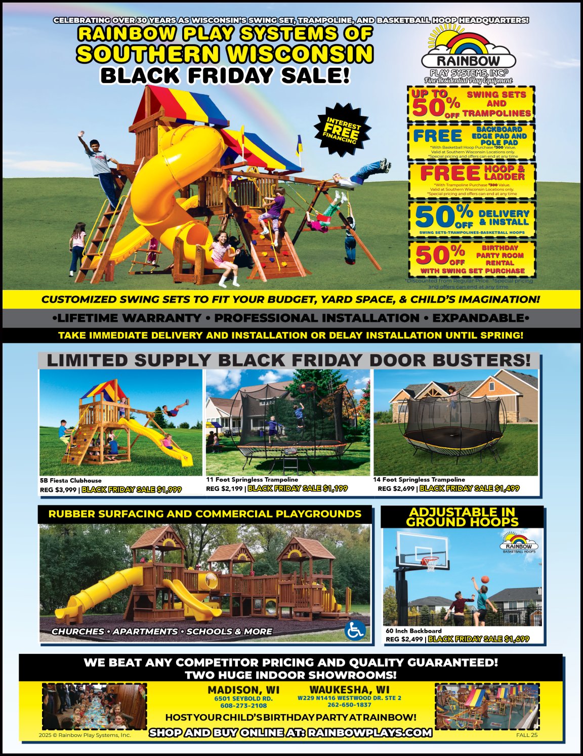 Rainbow of Southern Wisconsin is one of Wisconsin’s exclusive Rainbow Play Systems distributor. Located in Madison, Rainbow Swing Set Superstore is the original swing set distributor serving Wisconsinites for over 20 years. Visit their showrooms to play on and see our amazing Rainbow swing sets!
