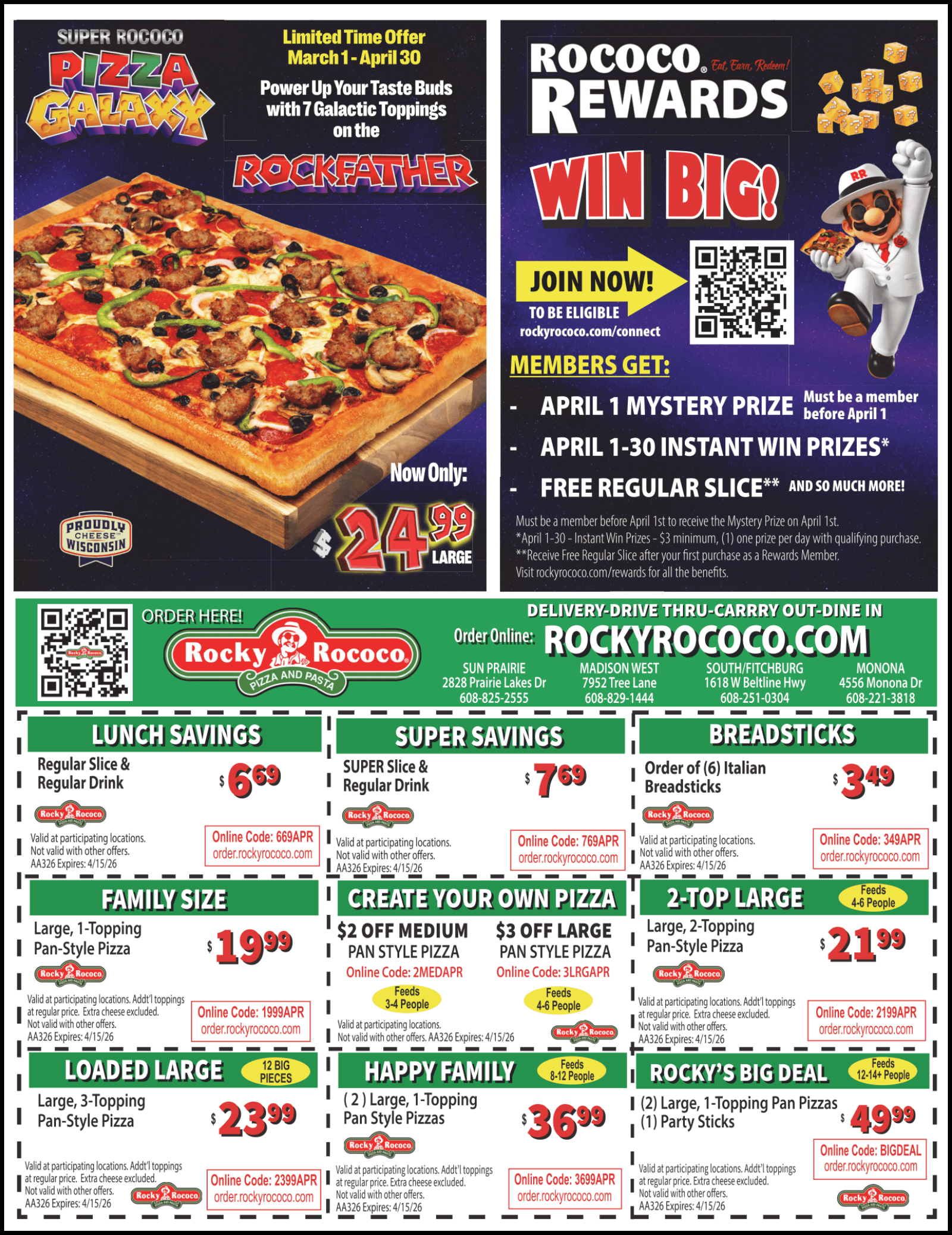 Rocky Rococo is a beloved Wisconsin-born pizza restaurant serving up pan-style pizzas, pasta, salads, and more with a focus on fresh dough and high-quality ingredients. Since its start in Madison in 1974, Rocky Rococo has grown into a go-to spot for flavorful, hand-made pizza by the slice or pie, perfect for dine-in, takeout, or catering your next gathering. Whether you’re craving cheesy slices, hearty pasta, or crispy breadsticks, Rocky’s delivers classic comfort food with a tasty twist.