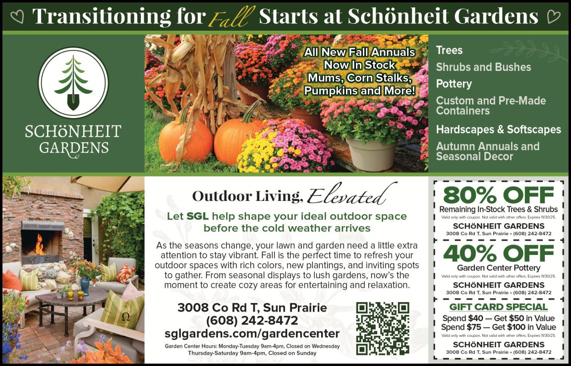Schönheit Gardens is known in the Madison area for creative landscape designs, expert garden maintenance, and stunning hardscapes. Whether you're adding colorful plants, building a patio, or need help with upkeep, our skilled team can bring your dream garden to life. Visit our retail nursery just 3 miles east of Madison for unique perennials, annuals, shrubs, and trees.