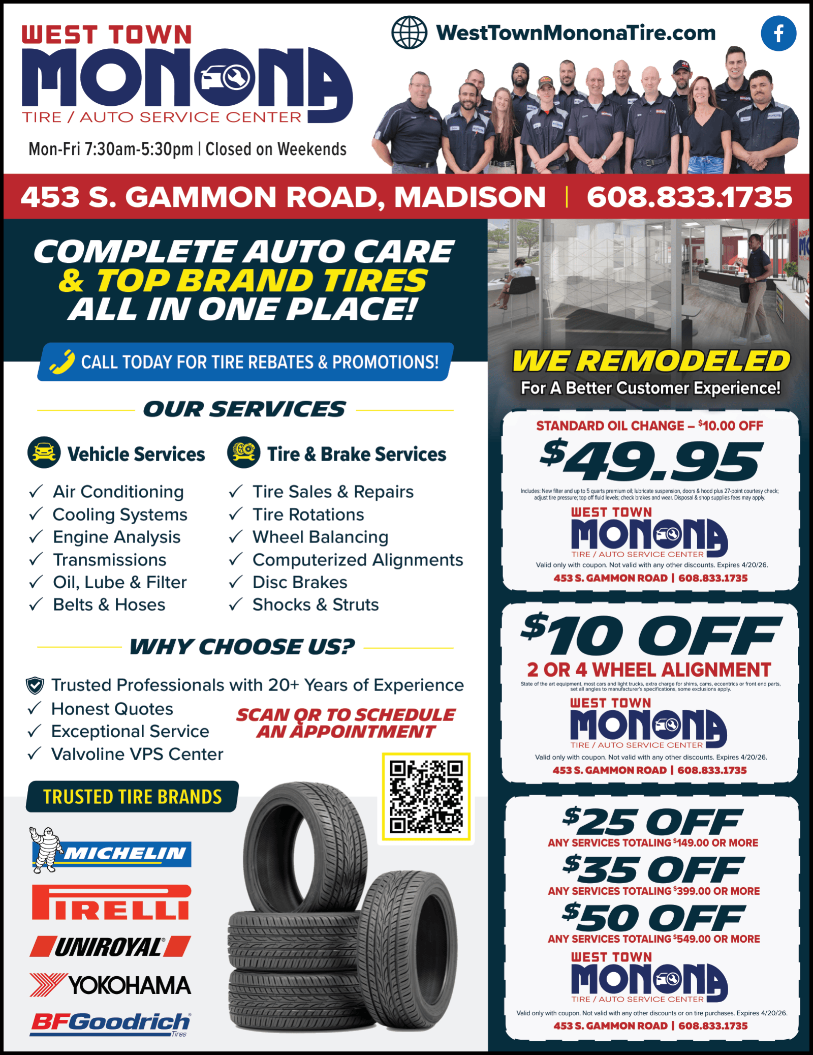 West Town Monona Tire proudly serves the local Madison, WI area. We understand that getting your car fixed or buying new tires can be overwhelming. Let us help you choose from our large selection of tires. We feature tires that fit your needs and budget from top quality brands, such as Michelin®, BFGoodrich®, Uniroyal®, and more. We pride ourselves on being your number one choice for any auto repair.